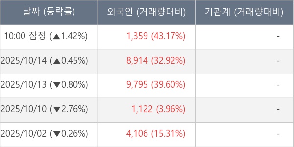 [서울=뉴스핌] 로보뉴스 = 15일 10시 15분 현재 케이엔에스(432470)는 전일 대비 1.42% (현재가 11,400원) 상승했고, 외국인이 최근 5일 연속 순매수(누적 25,296주, 잠정) 행진을 하고 있다.