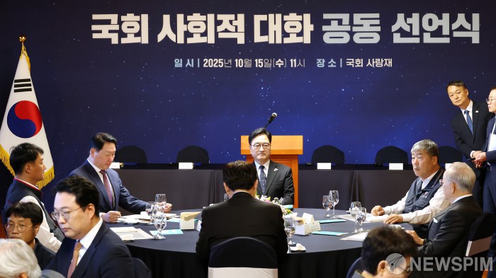 [서울=뉴스핌] 정일구 기자 = 우원식 국회의장과 노사 5단체 대표들이 15일 오전 서울 여의도 국회 사랑재에서 열린 국회 사회적 대화 공동 선언식에 참석해 있다. 2025.10.15 mironj19@newspim.com