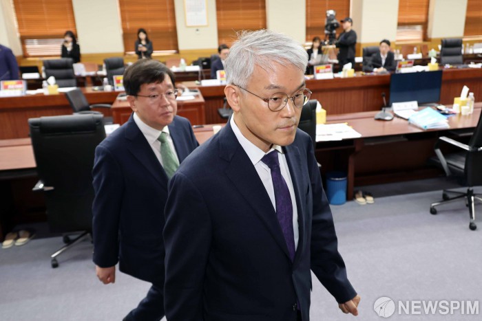 [서울=뉴스핌] 국회사진기자단 = 천대엽 법원행정처 처장이 15일 오전 서울 서초구 대법원에서 열린 국회 법제사법위원회 국정감사에서 준비한 인사말을 하지 못한 채 국감장을 나서고 있다. 2025.10.15 photo@newspim.com