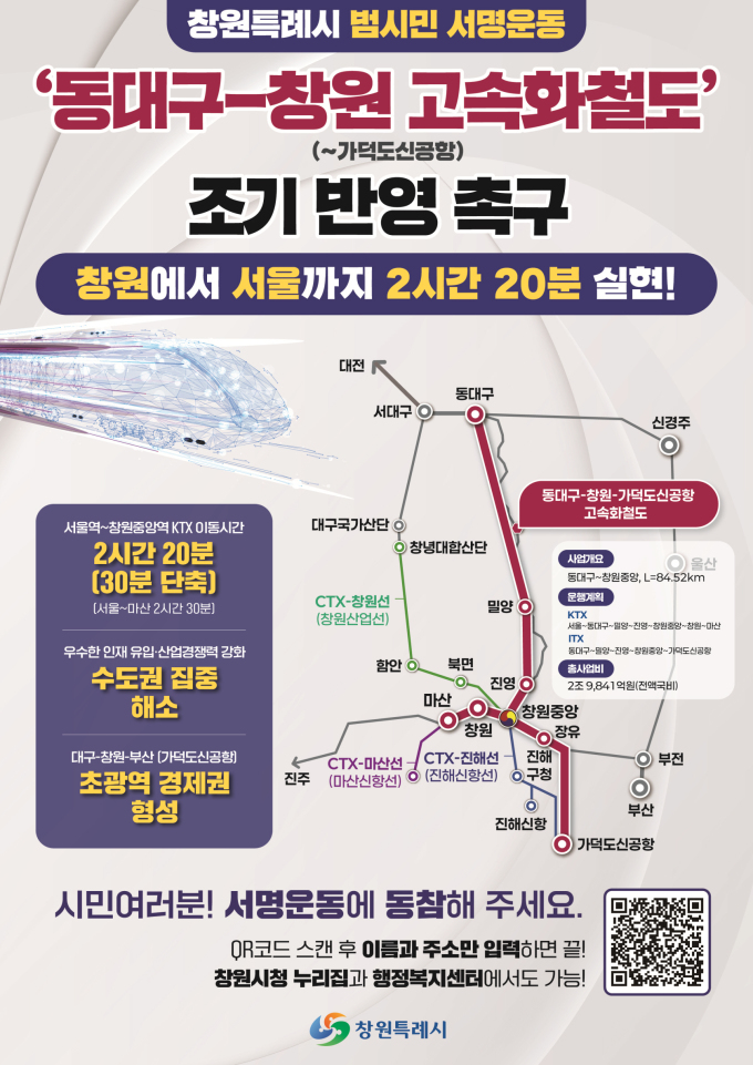 시는 지난 추석부터 마산역, 창원역, 창원중앙역 등 주요 철도 거점에 현수막을 게시하며 시민 홍보를 이어오고 있다. 본격적인 서명운동이 시작되는 17일부터는 KTX역 3곳을 중심으로 캠페인을 확대하고, 각종 지역 행사와 학교·기업체에서도 참여를 독려할 예정이다.