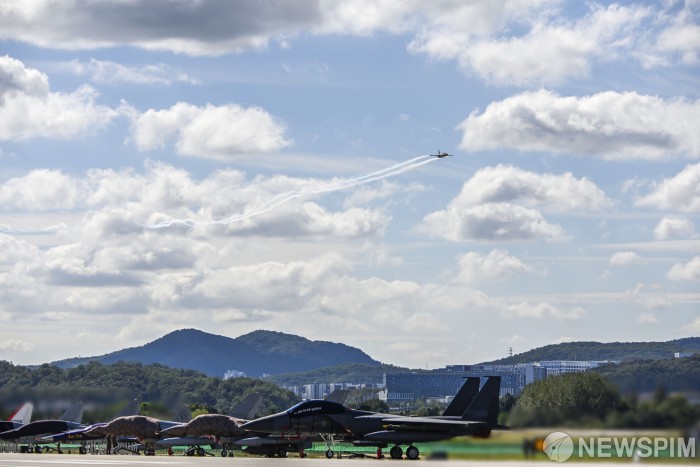 [서울=뉴스핌] 공군은 오는 10월 17일부터 19일까지 서울공항에서 서울 국제 항공우주 및 방위산업 전시회(ADEX) '퍼블릭 데이'를 개최한다. 사진은 15일, 퍼블릭데이를 앞두고 행사장 상공에서 시범비행 사전연습을 하고 있는 국산 고등훈련기 T-50. [사진=공군] 2025.10.15 photo@newspim.com
