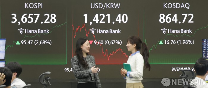 [서울=뉴스핌] 양윤모 기자 = 15일 오후 코스피가 전장 종가보다 95.47 포인트(2.68%) 상승하며 3657.28로, 코스닥은 16.76 포인트(1.98%) 상승한 864.72로 장을 마감한 가운데, 서울 중구 하나은행 딜링룸에서 직원들이 업무를 보고 있다. 서울외환시장에서 달러/원 환율은 전장 대비 9.60원 하락한 1421.40원에 거래를 마감했다. 2025.10.15 yym58@newspim.com