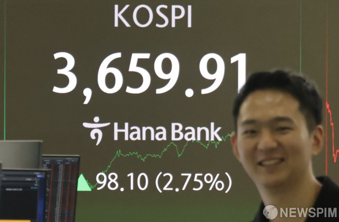 [서울=뉴스핌] 양윤모 기자 = 15일 오후 코스피가 전장 종가보다 장중 98.10 포인트(2.75%) 상승하며 3659.91로 거래되는 가운데, 서울 중구 하나은행 딜링룸에서 직원들이 업무를 보고 있다. 서울외환시장에서 달러/원 환율은 전장 대비 9.60원 하락한 1421.40원에 거래를 마감했다. 2025.10.15 yym58@newspim.com