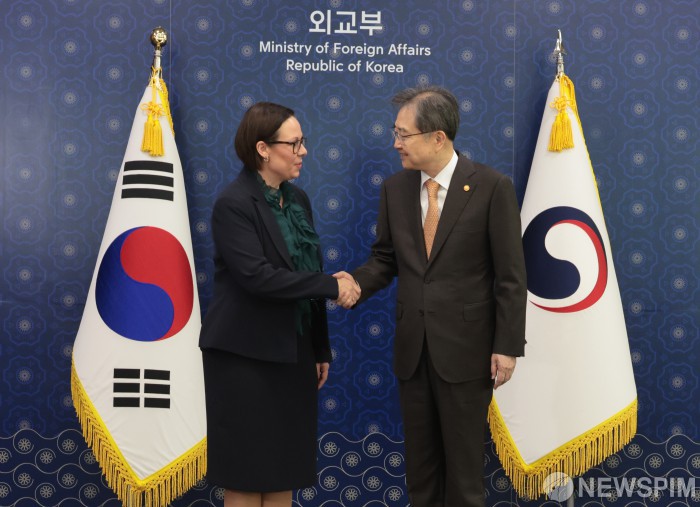 [서울=뉴스핌] 이길동 기자 = 조현 외교장관이 16일 서울 종로구 외교부 청사에서 말메르 스테네르가드(Malmer Stenergard) 스웨덴 외교부 장관과 면담에 앞서 악수하고 있다. 2025.10.16 gdlee@newspim.com