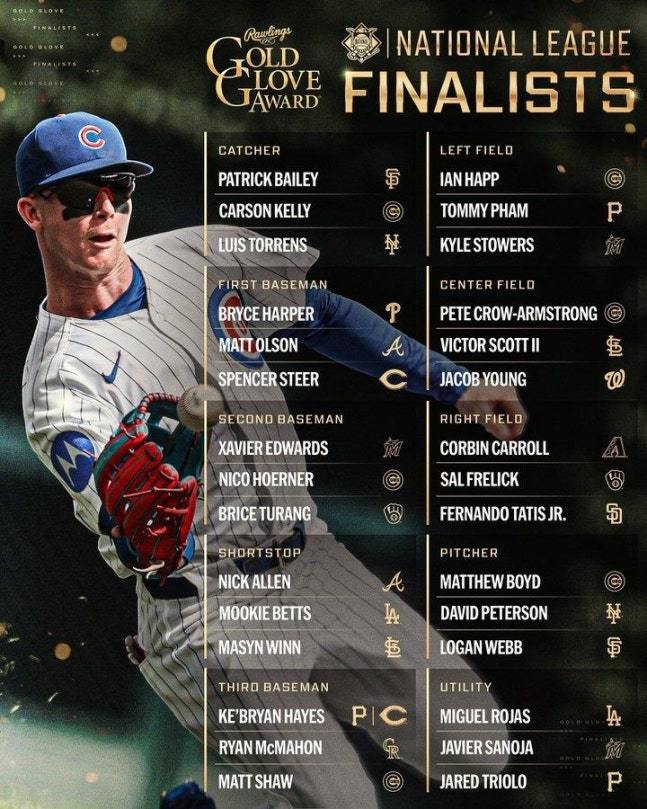 이 가운데 내셔널리그에서는 시카고 컵스가 가장 많은 후보를 배출했다. 컵스는 무려 6명의 선수가 명단에 포함되며, 리그 최다 후보를 기록했다. 특히 외야수 이언 햅은 NL 좌익수 부문에서 4년 연속 골드글러브 수상을 노린다.