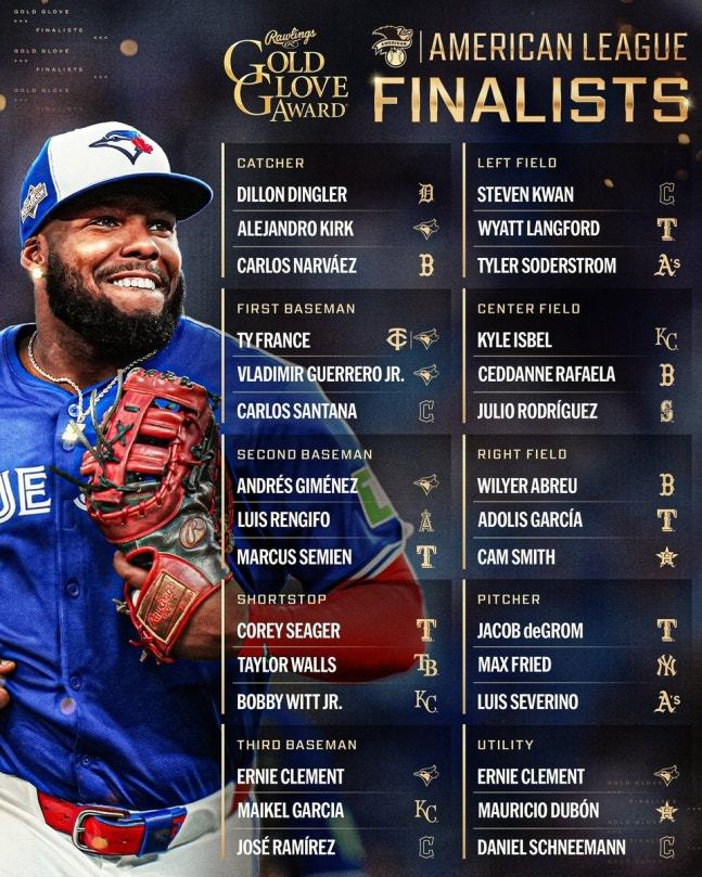 아메리칸리그에서는 토론토가 두각을 나타냈다. 토론토는 5명의 선수가 6개 부문에 이름을 올렸고, 이 중 어니 클레멘트는 3루수와 유틸리티 부문 두 곳에서 동시 후보에 올랐다. 클리블랜드의 2루수 안드레스 히메네스와 좌익수 스티븐 콴은 각각 4년 연속 수상에 도전한다.