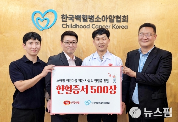 [익산=뉴스핌] 고종승 기자 = 종합식품기업 ㈜하림이 소아암 어린이 치료 지원을 위해 임직원들이 모은 사랑의 헌혈증서 500장을 한국백혈병소아암협회에 전달했다고 16일 밝혔다.