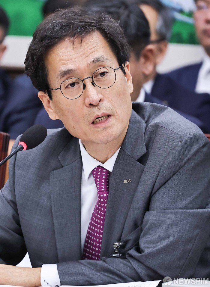 [서울=뉴스핌] 윤창빈 기자 = 함진규 한국도로공사 사장이 16일 오전 서울 여의도 국회에서 열린 국토교통위원회의 한국도로공사 등에 대한 국정감사에서 의원 질문에 답변하고 있다. 2025.10.16 pangbin@newspim.com