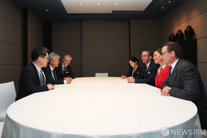 [서울=뉴스핌] 문신학 산업통상부 차관이 16일 서울 용산구 그랜드 하얏트호텔에서 열린 한-스웨덴 지속가능 파트너십 서밋에서 빅토리아 스웨덴 왕세녀와 다니엘 왕자를 비롯한 참석자들과 대화를 나누고 있다. [사진=산업통상부] 2025.10.16 photo@newspim.com