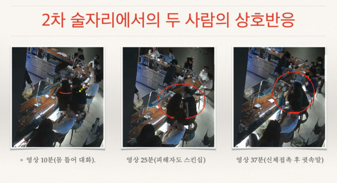검찰과 피고인 측이 모두진술을 마친 뒤, 재판은 증거조사 단계로 넘어갔다. 검찰 측은 혐의를 입증하기 위해 사건이 벌어진 위스키바의 폐쇄회로(CC)TV 캡처 사진을 증거로 제시했다. 해당 사진에는 A씨가 B씨의 허리를 손으로 감싸는 장면 등이 담겨 있었다. 이에 대해 A씨 측은 "B씨 역시 A씨를 향해 몸을 틀어 대화하는 모습을 여러 차례 확인할 수 있다"고 맞섰다.