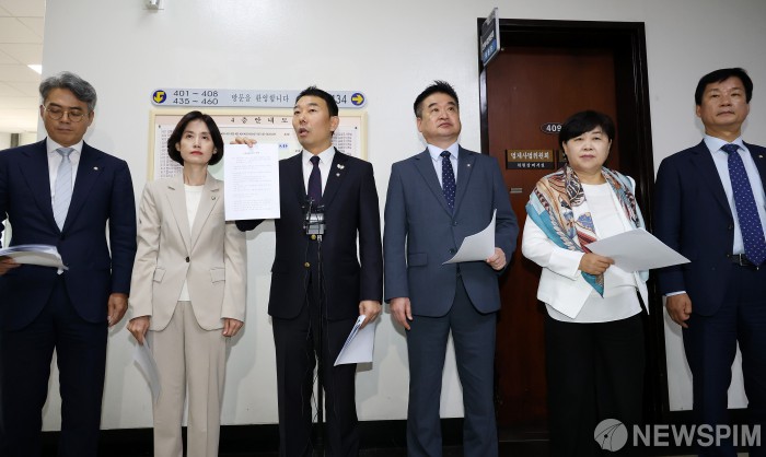 [서울=뉴스핌] 정일구 기자 = 김용민 국회 법제사법위원회 더불어민주당 간사를 비롯한 의원들이 16일 서울 여의도 국회 법제사법위원회에서 열린 감사원에 대한 국정감사가 중지된 뒤 전날 대법원 현장검증에 대한 국민의힘의 사실 왜곡 관련 기자회견을 하고 있다. 2025.10.16 mironj19@newspim.com