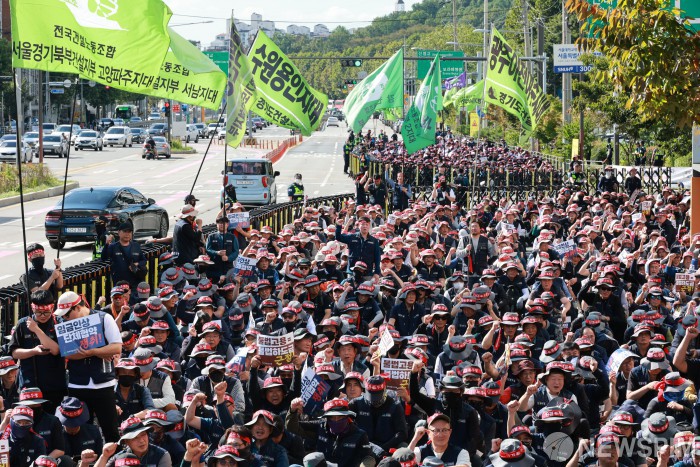 [서울=뉴스핌] 김학선 기자 = 16일 서울 관악구에서 열린 건설노조 전국동시다발 총파업 출정식에서 조합원들이 구호를 외치고 있다. 조합원들은 이날 출정식에서 '임금 및 단체협약 투쟁 승리, 중대재해, 불법하도급, 불법고용, 체불 건설현장 4대악 근절'을 촉구했다. 2025.10.16 yooksa@newspim.com