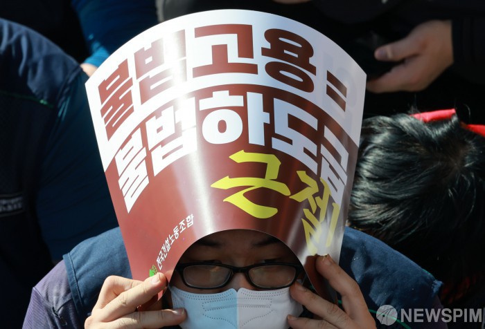 [서울=뉴스핌] 김학선 기자 = 건설노조가 16일 서울 관악구에서 전국동시다발 총파업 출정식을 열고 있다. 조합원들은 이날 출정식에서 '임금 및 단체협약 투쟁 승리, 중대재해, 불법하도급, 불법고용, 체불 건설현장 4대악 근절'을 촉구했다. 2025.10.16 yooksa@newspim.com