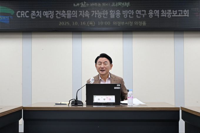 김동근 시장이 10월 16일 시청 의정홀에서 '캠프 레드클라우드(CRC) 존치 예정 건축물 활용 방안 연구'에 대한 결과 보고회를 진행하고 있다.[사진=의정부시] 2025.10.16 sinnews7@newspim.com |