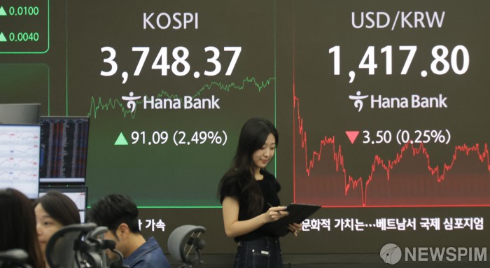 [서울=뉴스핌] 양윤모 기자 = 한미 무역협상의 최종 타결이 가시권에 들어온 가운데, 16일 오후 코스피가 전장 종가보다 91.09 포인트(2.49%) 상승하며 3748.37로, 코스닥은 0.69 포인트(0.08%) 상승한 865.41로 장을 마감한 가운데, 서울 중구 하나은행 딜링룸에서 직원들이 업무를 보고 있다. 서울외환시장에서 달러/원 환율은 전장 대비 3.50원 하락한 1417.80원에 거래를 마감했다. 2025.10.16 yym58@newspim.com