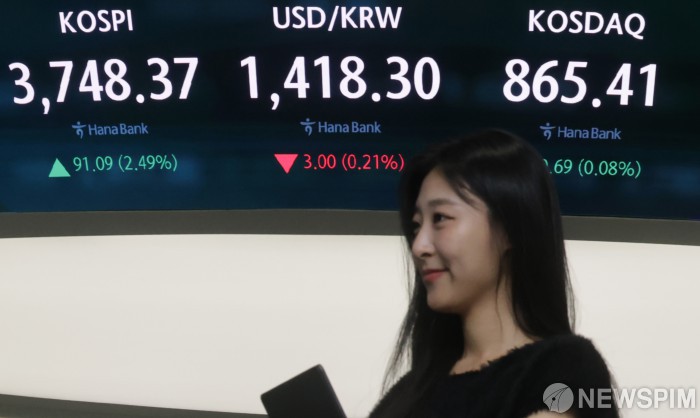 [서울=뉴스핌] 양윤모 기자 = 한미 무역협상의 최종 타결이 가시권에 들어온 가운데, 16일 오후 코스피가 전장 종가보다 91.09 포인트(2.49%) 상승하며 3748.37로, 코스닥은 0.69 포인트(0.08%) 상승한 865.41로 장을 마감한 가운데, 서울 중구 하나은행 딜링룸에서 직원들이 업무를 보고 있다. 서울외환시장에서 달러/원 환율은 전장 대비 3.00원 하락한 1418.30원에 거래를 마감했다. 2025.10.16 yym58@newspim.com