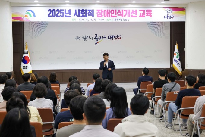 [대전=뉴스핌] 김수진 기자 = 대전 대덕구는 16일 구청 청렴관에서 공직자 100여 명이 참석한 가운데 '사회적 장애 인식개선 교육'을 진행했다. 최충규 대덕구청장은 "장애인에 대한 관심과 배려는 사회 구성원 모두가 함께 지켜야 할 공공의 가치"라며 "보이지 않는 장벽까지 살피는 행정으로, 장애와 비장애의 구분 없이 함께 어울리는 포용사회 실현에 앞장서겠다"고 말했다. [사진=대전 대덕구] nn0416@newspim.com