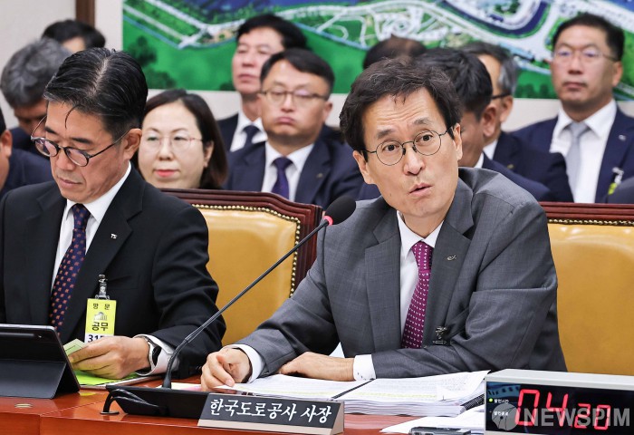 [서울=뉴스핌] 윤창빈 기자 = 함진규 한국도로공사 사장이 16일 오전 서울 여의도 국회에서 열린 국토교통위원회의 한국도로공사 등에 대한 국정감사에서 의원 질문에 답변하고 있다. 2025.10.16 pangbin@newspim.com |