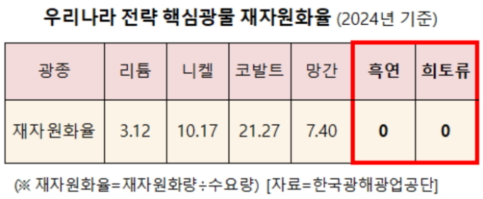 한국광해광업공단 자료(2024년 기준)에 따르면, 핵심 광물 대부분의 재자원화 실적이 없거나 극히 저조하다.