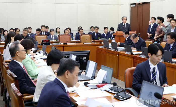 [서울=뉴스핌] 정일구 기자 = 정기석 국민건강보험공단 이사장이 17일 오전 서울 여의도 국회 보건복지위원회에서 열린 국민건강보험공단·건강보험심사평가원에 대한 국정감사에서 인사말을 하고 있다. 2025.10.17 mironj19@newspim.com