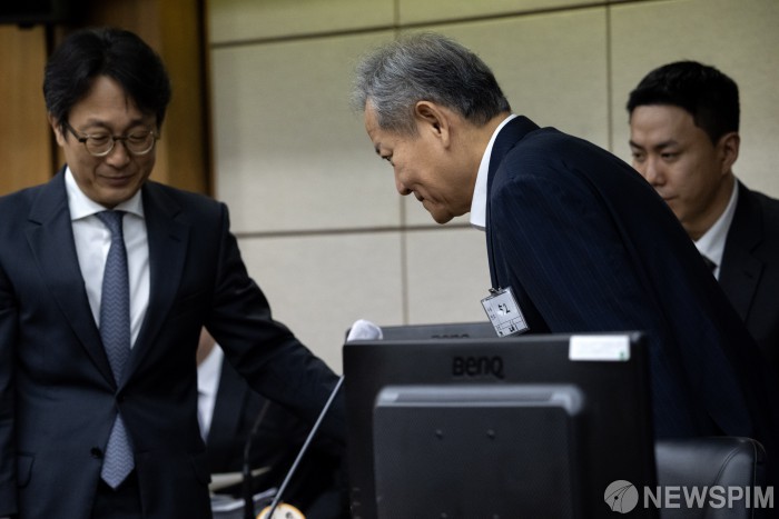 [서울=뉴스핌] 사진공동취재단 = 이상민 전 행정안전부 장관이 17일 서울 서초구 서울중앙지법에서 열린 내란 중요임무 종사 등 혐의 첫 공판기일에 출석해 인사하고 있다. 2025.10.17 photo@newspim.com