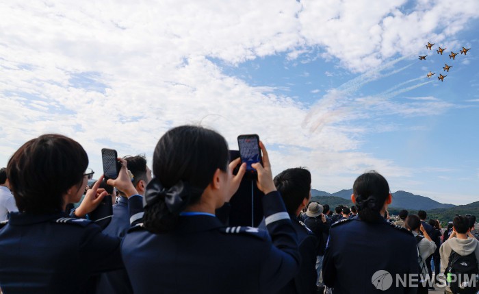 [성남=뉴스핌] 류기찬 기자 = 2025 서울 ADEX 개막일인 17일 오전 경기 성남시 서울공항에서 대한민국 공군 특수비행팀 블랙이글스가 비행을 하고 있다. 2025.10.17 ryuchan0925@newspim.com