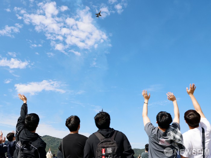 [성남=뉴스핌] 류기찬 기자 = 2025 서울 ADEX 개막일인 17일 오전 경기 성남시 서울공항에서 대한민국 공군 특수비행팀 블랙이글스가 비행을 하고 있다. 2025.10.17 ryuchan0925@newspim.com