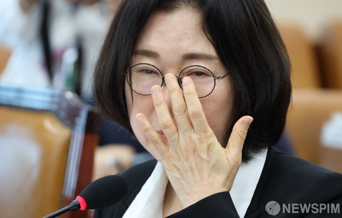 [서울=뉴스핌] 정일구 기자 = 이미선 기상청장이 17일 서울 여의도 국회 기후에너지환경노동위원회에서 열린 기상청 등에 대한 국정감사에서 안경을 고쳐 쓰고 있다. 2025.10.17 mironj19@newspim.com