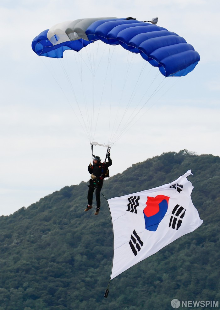 [성남=뉴스핌] 류기찬 기자 = 2025 서울 ADEX 개막일인 17일 오후 경기 성남시 서울공항에서 공군 특수부대 고공강하팀이 강하를 선보이고 있다. 2025.10.17 ryuchan0925@newspim.com