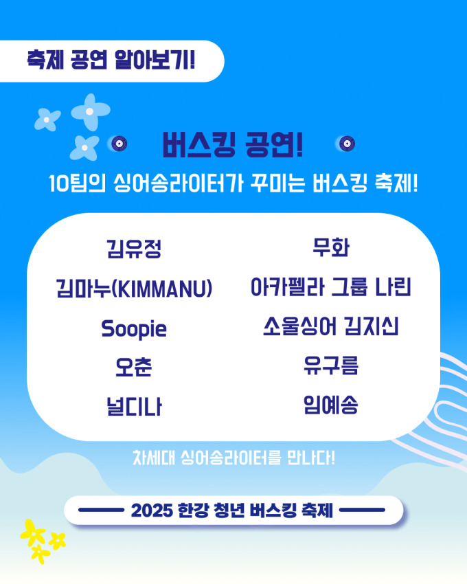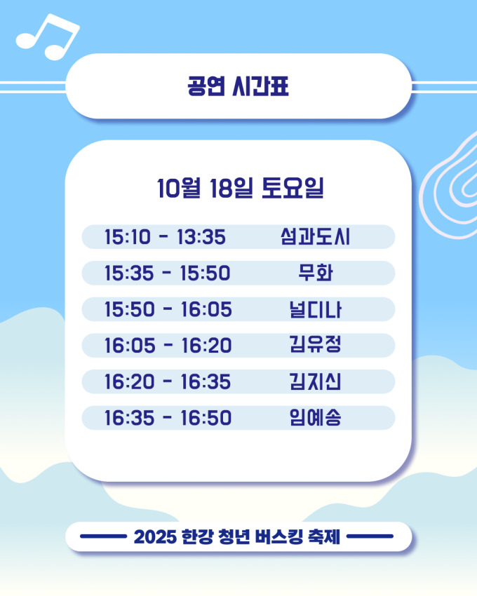[서울=뉴스핌] 오광수 문화전문기자 = 시원한 강바람이 부는 한강변에서 청년 뮤지션들의 노래를 원 없이 들을 수 있는 무대가 펼쳐진다. 18일 오후 1시 서울 반포한강공원 세빛섬 야외 무대서 열리는 '2025 한강 청년 버스킹 축제'는 다양한 음악을 구사하는 뮤지션과 시민들이 함께 어우러지는 가을 야외 축제다. 누구든 참여할 수 있는 무료 음악 페스티벌이다.