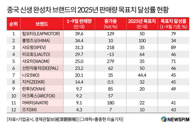 신생 완성차 제조사들의 3분기 기준 2025년 연간 판매량 목표치 달성 현황을 살펴보면, 샤오펑은 12개 기업 중 가장 높은 수준을 기록 중이다.