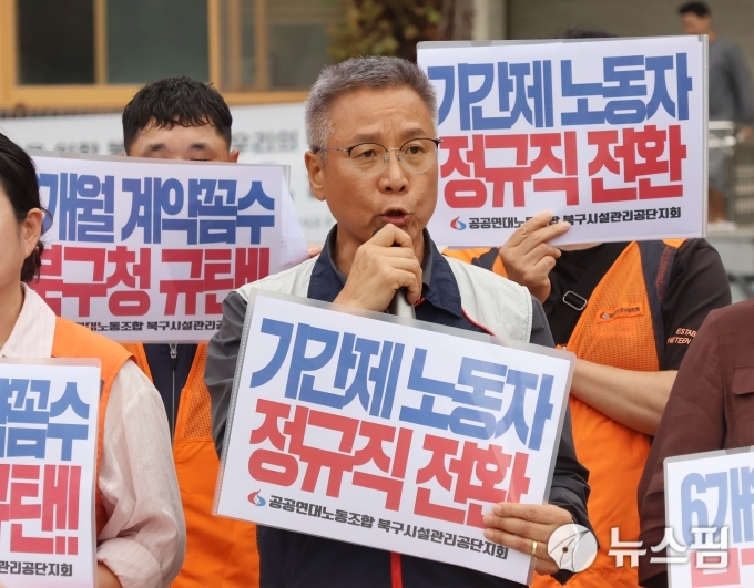 [광주=뉴스핌] 박진형 기자 = 이종욱 민주노총 광주지역본부장이 17일 북구청사 앞에서 개최된 민주노총 공공연대노동조합 광주 북구시설관리공단지회 주최 기자회견에 참석해 기간제 근로자의 정규직 전환을 함께 촉구했다. 2025.10.17 bless4ya@newspim.com
