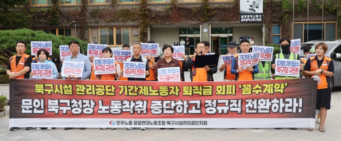 노조는 17일 북구청사 앞에서 "이들 노동자에게 6개월 또는 11개월 20일짜리 단위 계약을 반복하며 퇴직금 지급 및 정규직 전환 의무를 회피하고 있다"고 비판했다.