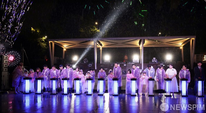 [서울=뉴스핌] 양윤모 기자 = 오승록 노원구청장이 17일 오후 서울 노원구 당현천 당현마루에서 열린 ‘2025 노원달빛산책: 모두의 달’ 개막식에 참석해 기념촬영을 하고 있다. 올해로 6회째를 맞은 노원달빛산책은 노원구가 매년 가을 개최하는 공공미술 빛조각축제로, 당현천 2km 구간(상계역 수학문화관~중계역 당현1교)에서 펼쳐진다. ‘모두의 달’을 주제로 한 올해 전시는 달이 가진 보편적 상징성을 통해 개인의 이야기가 공동체의 빛으로 확장되는 과정을 표현했다. 국내외 18팀의 아티스트가 참여해 30여 점의 작품을 선보였으며, 예술을 통해 ‘함께의 가치’를 조명한다. 특히 대만 타이난시 ‘월진항등제’와의 협약을 통해 초청된 대만 작가팀 UxU Studio는 대형 설치작품 〈Infinity Nowon〉, 미디어아트 1세대 작가 이용백의 〈엔젤-솔저〉, 세계 곳곳에 설치된 거대 조각상 유영호 작가의 〈그리팅 맨〉 등의 작품도 전시돼 당현천을 빛으로 물들인다. [사진=노원구청] 2025.10.18 yym58@newspim.com