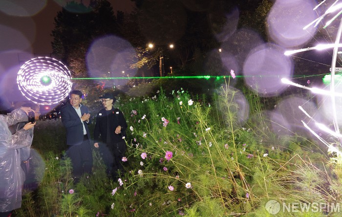 [서울=뉴스핌] 양윤모 기자 = 오승록 노원구청장이 17일 오후 서울 노원구 당현천 당현마루에서 열린 '2025 노원달빛산책: 모두의 달' 개막식에 참석해 대만 타이난시 '월진항등제'와의 협약을 통해 초청된 대만 작가팀 UxU Studio의 대형 설치작품 〈Infinity Nowon〉을 작가의 소개로 감상하고 있다.