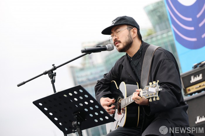 [서울=뉴스핌] 정일구 기자 = '히든스테이지 시즌3 TOP10' 김마누가 18일 오후 서울 서초구 반포한강공원 세빛섬 야외무대에서 감엔터테인먼트 주최로 열린 '2025 한강 청년 버스킹 축제'에서 라이브 공연을 선보이고 있다. 2025.10.18 mironj19@newspim.com