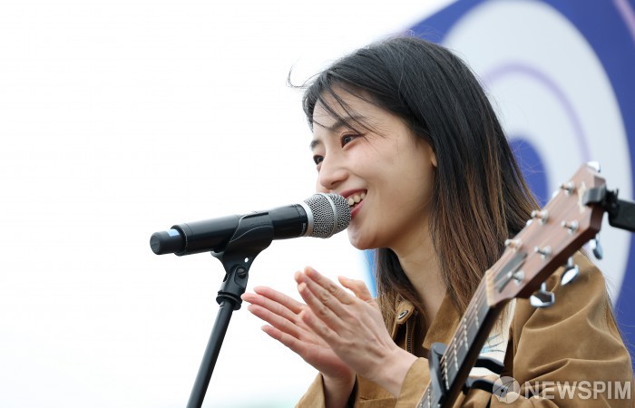 [서울=뉴스핌] 정일구 기자 = '히든스테이지 시즌3' 임예송이 18일 오후 서울 서초구 반포한강공원 세빛섬 야외무대에서 감엔터테인먼트 주최로 열린 '2025 한강 청년 버스킹 축제'에서 라이브 공연을 선보이고 있다. 2025.10.18 mironj19@newspim.com
