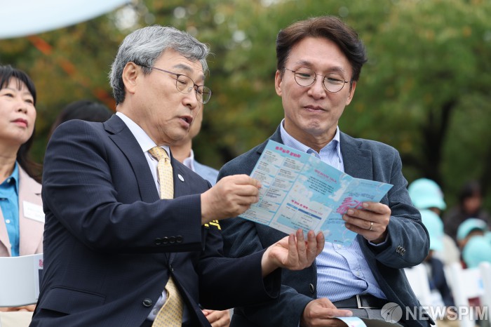 [서울=뉴스핌] 양윤모 기자 = 정근식 서울시교육감이 18일 오후 정독도서관 야외정원에서 열린 ‘제13회 온 가족 책 잔치’에 참석해 김민석 국무총리와 대화하고 있다. 이번 행사는 서울시교육청 산하 도서관·평생학습관 23개관이 함께하는 참여형 독서문화 축제다. [사진=서울시교육청] 2025.10.18 yym58@newspim.com