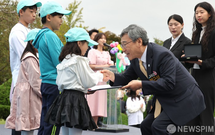 [서울=뉴스핌] 양윤모 기자 = 정근식 서울시교육감이 18일 오후 정독도서관 야외정원에서 열린 ‘제13회 온 가족 책 잔치’에 참석해 책읽는 온가족 인증서를 수여하고 있다. 이번 행사는 서울시교육청 산하 도서관·평생학습관 23개관이 함께하는 참여형 독서문화 축제다. [사진=서울시교육청] 2025.10.18 yym58@newspim.com