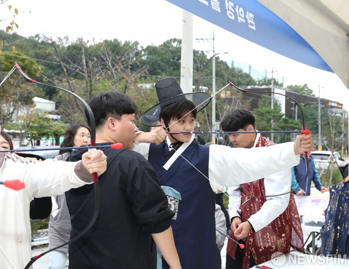 [서울=뉴스핌] 양윤모 기자 = 18일 서울 관악구 낙성대공원 대광장에서 개최된 '2025 관악강감찬축제'를 찾은 방문객이 한복을 입고 활쏘기를 체험하고 있다. 전통 활쏘기 프로그램은 ‘강감찬 후예: 국궁에 꽂히다’ 부스에서 국궁 전문기관 ‘관악정’과 연계해 주민 체험 콘텐츠로 마련됐다. 2일차를 맞이한 관악강감찬축제에는 ‘관악 퍼레이드 21’ 등 주민 참여 상설 프로그램이 본격적으로 시작됐다. 저녁 7시 대광장에서는 강감찬 장군의 일상을 극화한 주제공연 ‘낙성연희’와 화려한 불꽃놀이가 축제의 하이라이트를 장식한다. [사진=관악구청] 2025.10.18 yym58@newspim.com