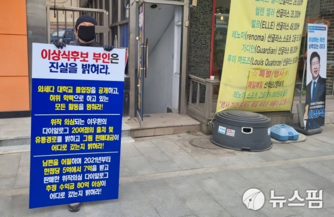지난해 3월 말 한 시민이 이상식 후보 선거사무소 앞에서 이 후보 배우자 학력에 의혹을 제기하는 문구를 적은 피켓을 들고 시위를 벌이는 중이다. [사진=뉴스핌 DB]
