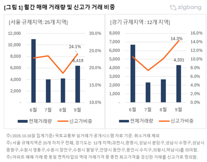 서울 내부에서도 규제지역과 핵심 입지를 중심으로 한 회복세가 뚜렷했다. 9월 기준 기존 규제지역인 서초구는 신고가 비중이 54%로 가장 높았고, 강남구 42%, 용산구 35%, 송파구 32%를 기록했다.