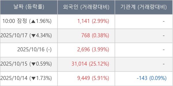 [서울=뉴스핌] 로보뉴스 = 20일 10시 15분 현재 씨티케이(260930)는 전일 대비 1.96% (현재가 4,945원) 상승했고, 외국인이 최근 7일 연속 순매수(누적 10.18만 주, 잠정) 행진을 하고 있다.