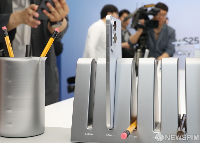 지난 5월 13일 오전 서울 서초구 서울 강남에서 열린 갤럭시 신제품 S25 엣지 미디어 브리핑 후 취재진들이 제품을 살펴 보고 있다. [사진=뉴스핌DB]