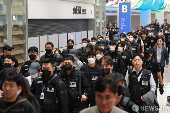 캄보디아에 구금돼 있던 한국인 64명이 18일 오전 인천공항을 통해 송환되고 있다. 이들은 보이스피싱 등 국제 범죄 조직에 가담한 혐의를 받고 있다. [사진=뉴스핌 DB] |