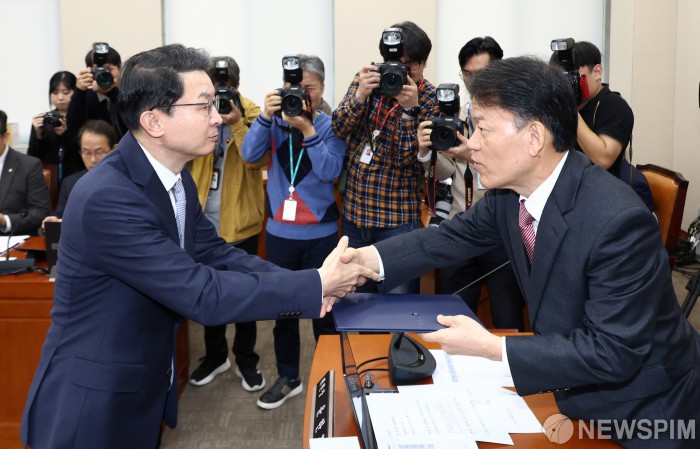 [서울=뉴스핌] 최지환 기자 = 이억원 금융위원장이 20일 오전 서울 여의도 국회 정무위원회에서 열린 금융위원회 등에 대한 국정감사에서 윤한홍 정무위원장에게 증인선서문을 제출하고 있다. 2025.10.20 choipix16@newspim.com
