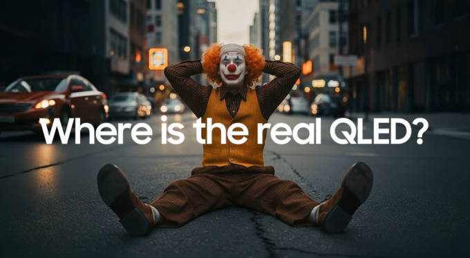 마케터가 "우리 TV엔 QD 시트도, 블루 백라이트도 없다"고 항의하자 상사는 "사람들은 진실에 관심이 없다"고 일축한다. 이후 '그건 가짜다. 진짜를 선택하라(It's fake. Choose real)'는 자막이 등장하며, 혼란에 빠진 마케터가 광대로 분장해 "진짜 QLED는 어디에 있냐"고 묻는 장면으로 마무리된다. 삼성전자가 풍자적으로 표현한 '가짜 QLED'의 실체는 TCL과 하이센스 등 중국 TV 제조사의 'QD 없는 QLED' 모델을 가리킨 것으로 해석된다.