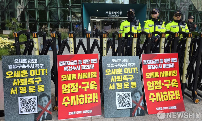 [서울=뉴스핌] 양윤모 기자 = 참여연대가 서울시청의 국회 국토교통위원회 국정감사가 시작된 20일 오전 서울시청 앞에서 서울 집값 상승과 서민 주거 불안 가중시키는 오세훈 시장 규탄 기자회견을 하고 있다. 2025.10.20 yym58@newspim.com