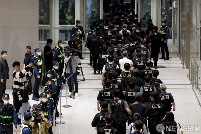 [영종도=뉴스핌] 이형석 기자 = 캄보디아에 구금돼 있던 한국인 64명이 18일 오전 인천공항을 통해 송환되고 있다. 이들은 보이스피싱 등 국제 범죄 조직에 가담한 혐의를 받고 있다. 2025.10.18 leehs@newspim.com
