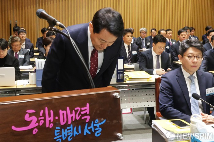 [서울=뉴스핌] 양윤모 기자 = 오세훈 서울시장이 20일 오전 서울시청에서 열린 국회 국토교통위원회 서울시 국정감사에 출석해 고개숙여 인사하고 있다. 2025.10.20 yym58@newspim.com
